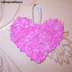 Завершающий этап Следующий этап изготовления детской поделки к Дню Святого Валентина – нарезка квадратиков из гофробумаги. Сердце мажем клеем, сминаем приготовленные квадраты бумаги и приклеиваем их к сердцу. Когда вся поверхность сердца будет заклеена бумагой, поделка будет готова.